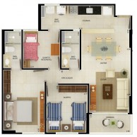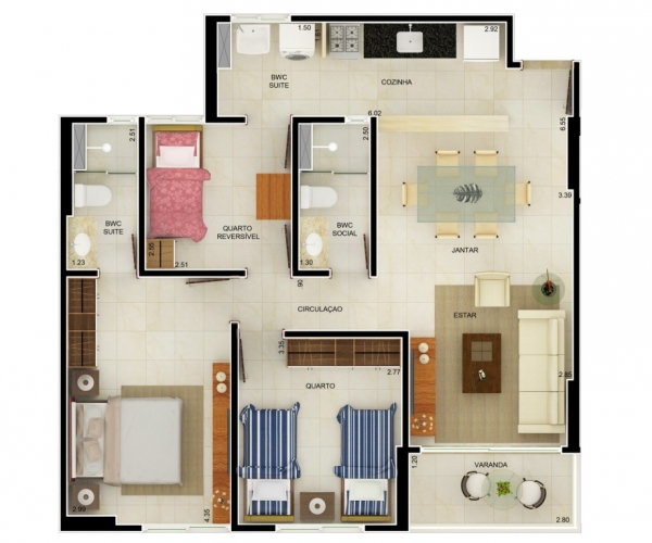 Apartamentos com final 04 e 05 possuem sala de jantar e estar, 03 quartos, sendo 01 suíte e 01 quarto reversível, varanda, cozinha, área de serviço, área técnica para ar-condicionado split e ainda 01 vaga de garagem.